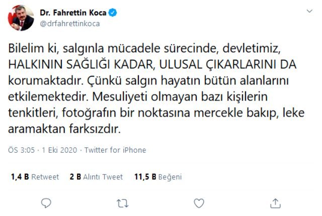 Bakan’ın bu sözleriyle ilgili çok sayıda eleştiri gelmesinin ardından Koca, sosyal medya hesabından yeni bir açıklama yayınladı. Koca açıklamasında “Bilelim ki, salgınla mücadele sürecinde, devletimiz, halkın sağlığı kadar, ulusal çıkarlarını da korumaktadır. Çünkü salgın hayatın bütün alanlarını etkilemektedir. Mesuliyeti olmayan bazı kişilerin tenkitleri, fotoğrafın bir noktasına mercekle bakıp, leke aramaktan farksızdır” ifadesini kullandı.