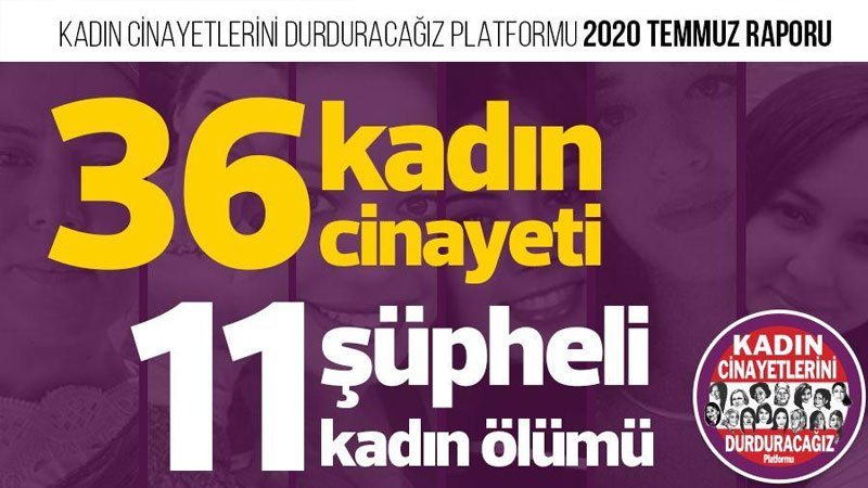 Kadınlara yönelik şiddet ve aile içi şiddeti önleme amacı taşıyan Avrupa Konseyi Sözleşmesi ya da bilinen adıyla İstanbul Sözleşmesi ile ilgili tartışmalar sürerken, Kadın Cinayetlerini Durduracağız Platformu’nun Twitter hesabından paylaştığı rapora göre; Temmuz ayında 36 kadın cinayete kurban gitti ve 11 kadının ölümü ise şüpheli bulundu.