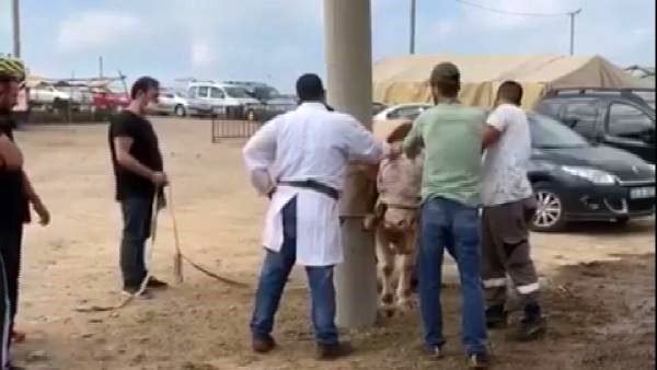 İstanbul’un ilçesi Ataşehir‘de kurban pazarında büyükbaş kurbanlık kesim öncesi direğe bağlandı. Kurban, kesim alanına götürüldüğü sırada tekmelediği kasap bir anda yere yığıldı. Bayılan kasap hastaneye götürüldü. Kasabın durumunun iyi olduğu öğrenildi.