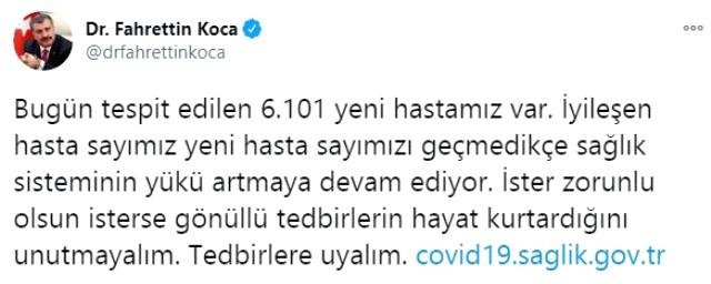 Bakan Koca, Twitter hesabından yaptığı açıklamada, “Bugün tespit edilen 6.101 yeni hastamız var. İyileşen hasta sayımız yeni hasta sayımızı geçmedikçe sağlık sisteminin yükü artmaya devam ediyor. İster zorunlu olsun isterse gönüllü tedbirlerin hayat kurtardığını unutmayalım. Tedbirlere uyalım” ifadelerini kullandı.