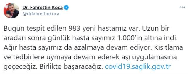 Bakan Koca, Twitter’dan yaptığı açıklamada, “Bugün tespit edilen 983 yeni hastamız var. Uzun bir aradan sonra günlük hasta sayımız 1.000’in altına indi. Ağır hasta sayımız da azalmaya devam ediyor. Kısıtlama ve tedbirlere uymaya devam ederek aşı uygulamasına geçeceğiz. Birlikte başaracağız” ifadelerini kullandı.