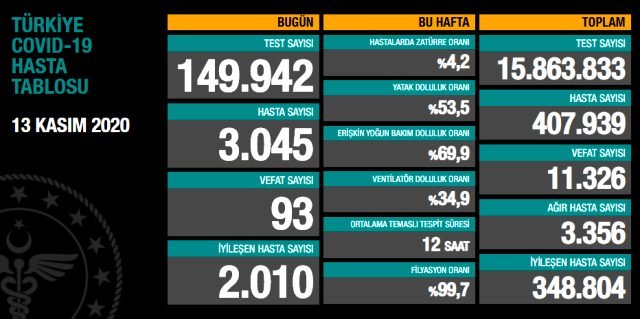 Sağlık Bakanlığı, Türkiye‘nin Günlük Koronavirüs Tablosu’nu paylaştı. 13 Kasım‘da açıklanan son 24 saatlik verilere göre; 3045 yeni hasta tespit edildi, vefat sayısı ise 93 olarak gerçekleşti. Böylece Türkiye’de koronavirüs nedeniyle hayatını kaybedenlerin sayısı 11 bin 326’ya, toplam hasta sayısı ise 407 bin 939’a yükseldi.