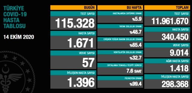 Sağlık Bakanı Fahrettin Koca, Bilim Kurulu Toplantısı’nın ardından 14 Ekim tarihli Türkiye‘nin Günlük Koronavirüs Tablosu’nu paylaştı. 14 Ekim’de açıklanan son 24 saatlik verilere göre; 1671 yeni vaka tespit edildi, vefat sayısı ise 57 olarak gerçekleşti. Böylece Türkiye’de koronavirüs nedeniyle hayatını kaybedenlerin sayısı kritik eşiği aşarak 9 bin 14’e, toplam vaka sayısı ise 340 bin 450’ye yükseldi.