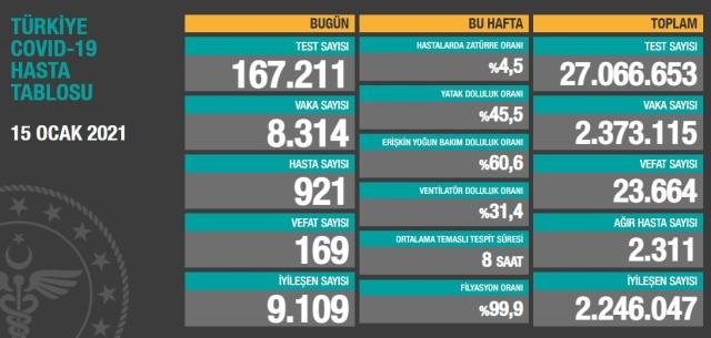 Sağlık Bakanlığı, Türkiye‘nin Günlük Koronavirüs Tablosu’nu paylaştı. 15 Ocak‘ta açıklanan son 24 saatlik verilere göre; 921’i semptomatik olmak üzere toplam 8 bin 314 yeni vaka tespit edildi. Vefat sayısı ise 169 olarak kayıtlara geçti. Böylece Türkiye’de koronavirüs nedeniyle hayatını kaybedenlerin sayısı 23 bin 664’e, toplam vaka sayısı ise 2 milyon 373 bin 115’e yükseldi.