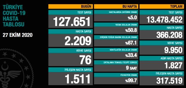 Sağlık Bakanlığı, Türkiye‘nin Günlük Koronavirüs Tablosu’nu paylaştı. 27 Ekim‘de açıklanan son 24 saatlik verilere göre; 2209 yeni hasta tespit edildi, vefat sayısı ise 76 olarak gerçekleşti. Böylece Türkiye’de koronavirüs nedeniyle hayatını kaybedenlerin sayısı 9 bin 950’ye, toplam vaka sayısı ise 366 bin 208’e yükseldi.