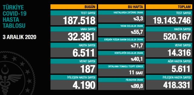Sağlık Bakanlığı, Türkiye‘nin Günlük Koronavirüs Tablosu’nu paylaştı. 3 Aralık açıklanan son 24 saatlik verilere göre; 6 bin 511’i semptomatik olmak üzere toplam 32 bin 381 yeni vaka tespit edildi. Vefat sayısı ise 187 olarak gerçekleşti. Böylece Türkiye’de koronavirüs nedeniyle hayatını kaybedenlerin sayısı 14 bin 316’ya, toplam hasta sayısı ise 520 bin 167’ye yükseldi.