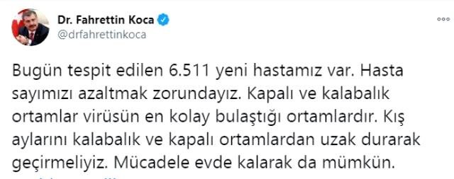 Bakan Koca, Twitter üzerinden yaptığı açıklamada, “Bugün tespit edilen 6.511 yeni hastamız var. Hasta sayımızı azaltmak zorundayız. Kapalı ve kalabalık ortamlar virüsün en kolay bulaştığı ortamlardır. Kış aylarını kalabalık ve kapalı ortamlardan uzak durarak geçirmeliyiz. Mücadele evde kalarak da mümkün” ifadelerini kullandı.