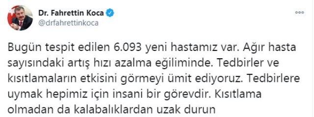 Bakan Koca, Twitter’dan yaptığı açıklamada, “Bugün tespit edilen 6.093 yeni hastamız var. Ağır hasta sayısındaki artış hızı azalma eğiliminde. Tedbirler ve kısıtlamaların etkisini görmeyi ümit ediyoruz. Tedbirlere uymak hepimiz için insani bir görevdir. Kısıtlama olmadan da kalabalıklardan uzak durun” ifadelerini kullandı.