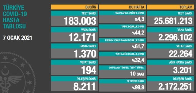 Sağlık Bakanlığı, Türkiye‘nin Günlük Koronavirüs Tablosu’nu paylaştı. 7 Ocak‘ta açıklanan son 24 saatlik verilere göre; bin 370’i semptomatik olmak üzere toplam 12 bin 171 yeni vaka tespit edildi. Vefat sayısı ise 194 olarak kayıtlara geçti. Böylece Türkiye’de koronavirüs nedeniyle hayatını kaybedenlerin sayısı 22 bin 264’e, toplam vaka sayısı ise 2 milyon 296 bin 102’ye yükseldi.