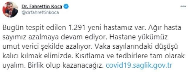 Bakan Koca, Twitter’dan yaptığı açıklamada, “Bugün tespit edilen 1.291 yeni hastamız var. Ağır hasta sayımız azalmaya devam ediyor. Hastane yükümüz umut verici şekilde azalıyor. Vaka sayılarındaki düşüşü kalıcı kılmak elimizde. Kısıtlama ve tedbirlere tam olarak uyalım. Birlik olup kazanacağız” ifadelerini kullandı.