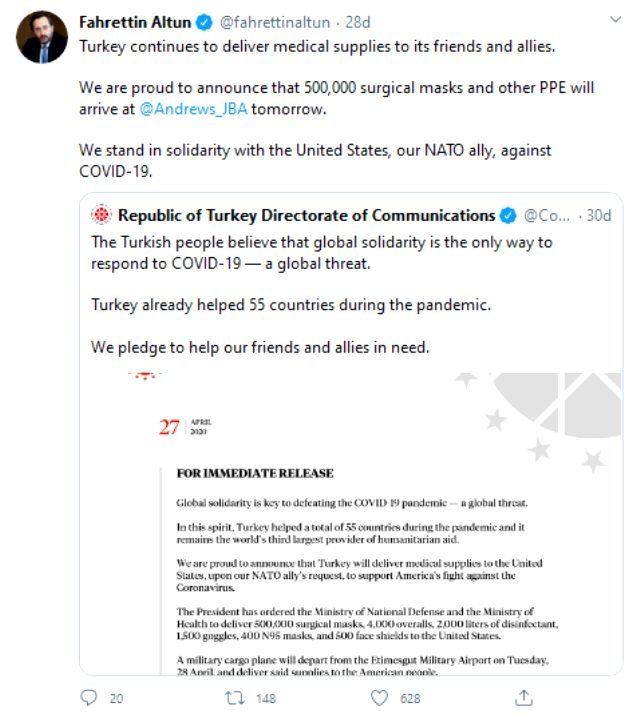 Altun, Türkiye’nin Kovid-19 salgını karşısında NATO müttefiki ABD’nin yanında durduğunu belirttiği açıklamasında, 500 bin cerrahi maske ve medikal ürünlerin yarın bu ülkeye ulaşacağı haberini verdi. Altun aynı paylaşımda İletişim Başkanlığı resmi Twitter hesabının paylaştığı, 55 ülkeye yapılan yardımları anlatan başka bir tweeti alıntıladı.