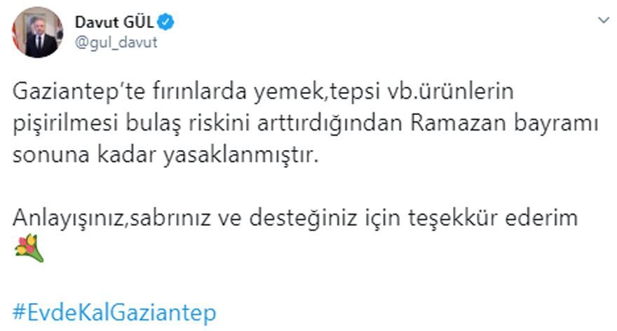 Gaziantep Valisi Davut Gül, corona tedbirleri kapsamında alınan yeni kararı Twitter hesabından duyurdu.