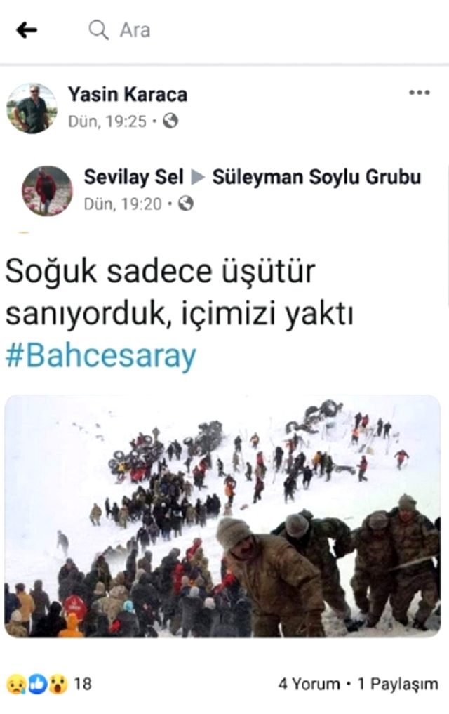 Tarkan Karaca’nın esnaflık yapan babası Yasin Karaca’nın, ilk çığ haberini aldığı sırada sosyal medya hesabında “Allahım yardım et bu çocuklara” dediği görüldü. Karaca, oğlunun ölüm haberini aldıktan sonra ise ‘Soğuk sadece üşütür sanıyorduk, içimizi yaktı” paylaşımında bulundu.