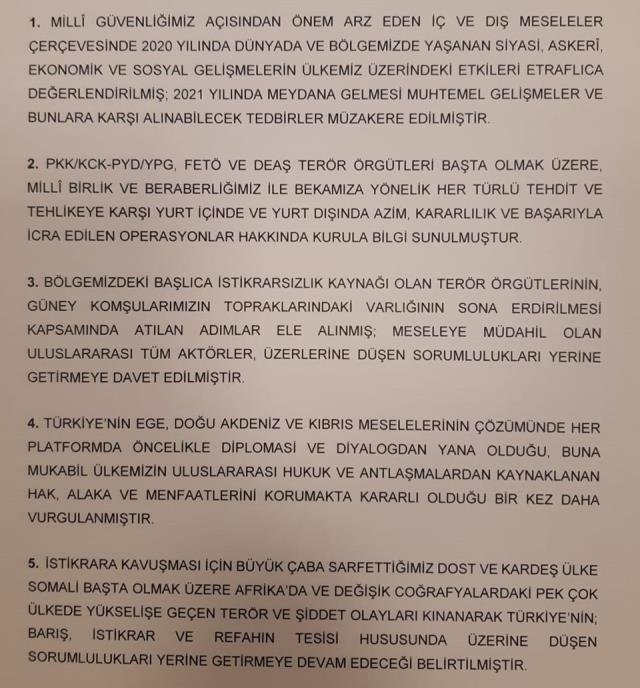 Toplantıdan sonra yayınlanan bildiride Doğu Akdeniz meselesine ilişkin, “Türkiye’nin Doğu Akdeniz ve Kıbrıs meselelerinin çözümünde her platformda öncelikle diplomasi ve diyalogdan yana olduğu, Buna mukabil ülkemizin uluslararası hukuk ve antlaşmalardan kaynaklanan hak, alaka ve menfaatlerini korumakta kararlı olduğu bir kez daha vurgulanmıştır.” ifadelerine yer verildi.