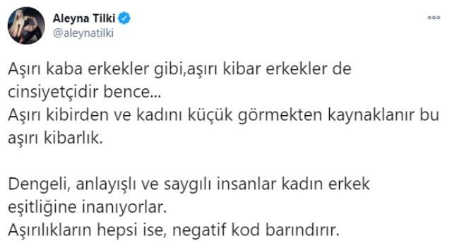 Sosyal medya hesabı Twitter üzerinden yaptığı yorumla çok konuşulan Aleyna Tilki, “Aşırı kaba erkekler gibi, aşırı kibar erkekler de cinsiyetçidir bence… Aşırı kibirden ve kadını küçük görmekten kaynaklanır bu aşırı kibarlık. Dengeli, anlayışlı ve saygılı insanlar kadın erkek eşitliğine inanıyorlar. Aşırılıkların hepsi ise negatif kod barındırır” ifadelerini kullandı.