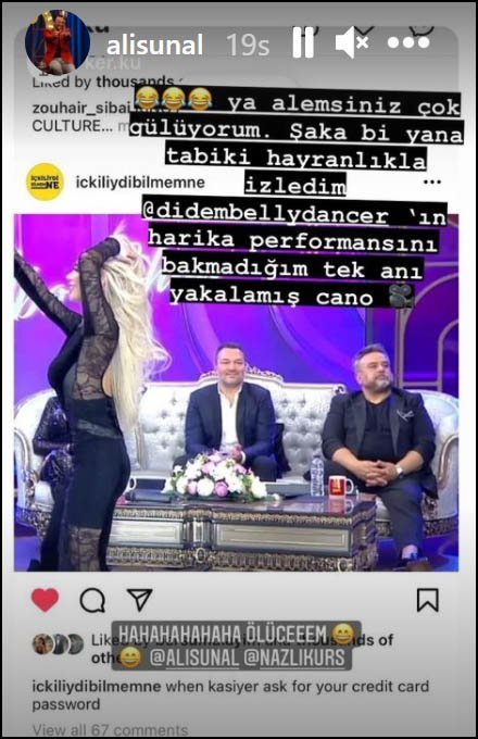 Programın bir diğer konuğu Ali Sunal konuyla ilgili olarak kendisinin de gösteriyi izlemiyor gibi göründüğü bir karenin sosyal medyada paylaşılması üzerine, “Ya alemsiniz çok gülüyorum. Şaka bir yana tabii ki hayranlıkla izledim. Didem Kınalı’nın harika performansını bakmadığım tek anı yakalamış cano” dedi.