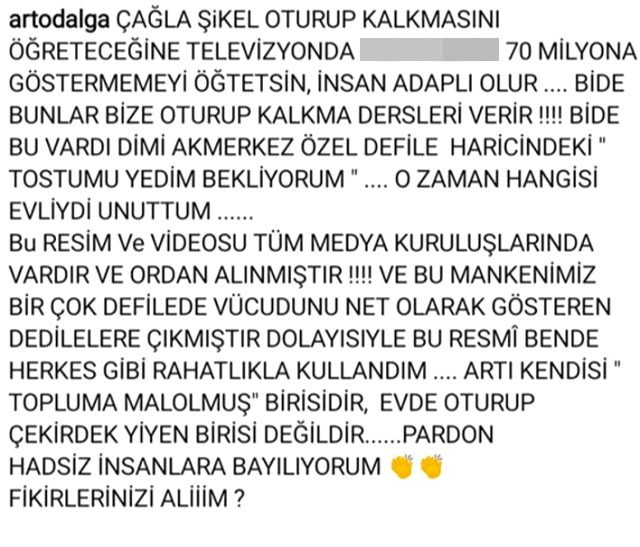 “Arkadaşlar merhaba. Amerika’dan selamlar. Çok merak ediyorum bir sürü yorum okuyorum Çağla’yla ilgili bir resim koydum ve göğsü görünen bir resim flu da olsa. Bütün medya kuruluşlarında ve televizyonlarda yayınlanmış bir resim. Bazı insanlar benim üstüme yükleniyor. Çok af edersiniz size oturup kalkma dersleri verebilen bir manken yani çağla Şikel, oturup kalkma dersi, nasıl oturulacağını nasıl dizler açılmadan iç çamaşırınızı göstermeden nasıl kalkılabileceğini gösteren ve bunları çok iyi bilen bir kadın göğsünü açıyorsa ya da defilelerde orasını burasını gösteriyorsa demek ki bunları da bilerek gösteriyor. Bilerek yapıyor demektir.”