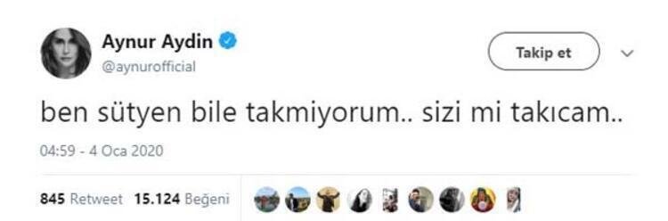 Gelen yorumlara ise “Takip etmek zorunda değilsiniz” diyerek tepki göstermişti. 34 yaşındaki şarkıcı Twitter hesabından yaptığı paylaşımda, “Ben sütyen bile takmıyorum.. sizi mi takacağım…” yazmıştı. Ünlü şarkıcının takipçileri, “Sütyenle arandaki problem ne?” şeklinde çok sayıda yorumda bulunmuştu.