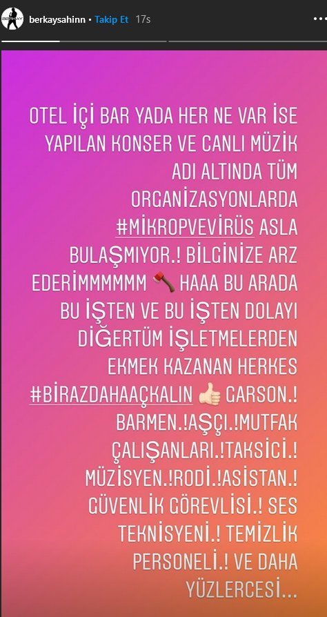 “Otel içi, bar ya da her ne var ise yapılan ‘konser ve canlı müzik’ adı altında tüm organizasyonlarda mikrop ve virüs asla bulaşmıyor. Bilginize arz ederimmmm.