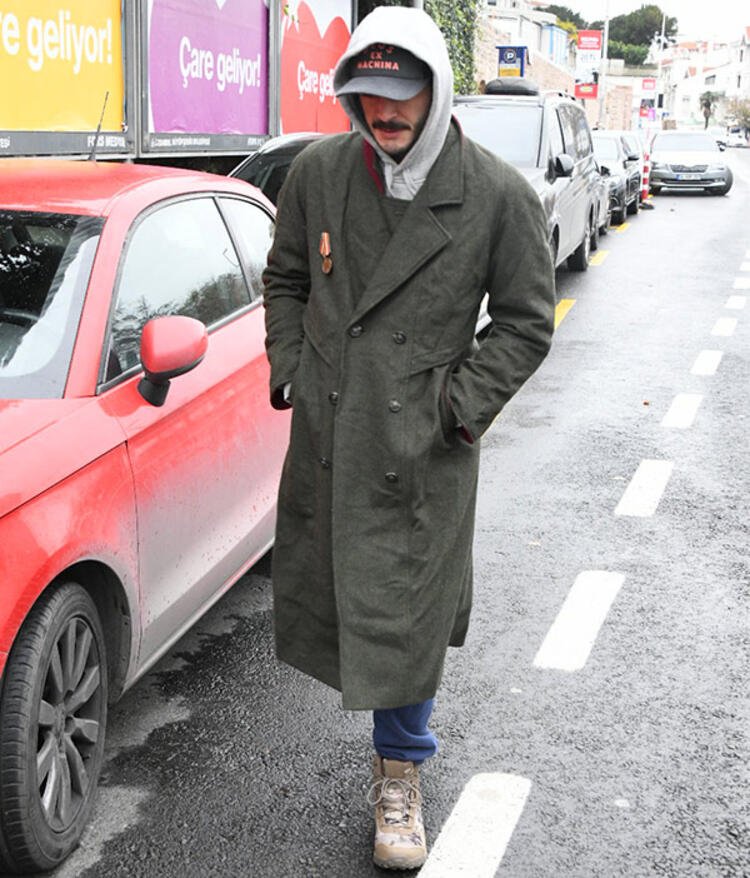 Burak Deniz, buruşuk pardesüsü, madalyası ve asker botlarıyla dikkatleri üzerine çekti.