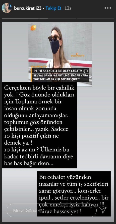 “Gerçekten böyle bir cahillik yok. Göz önünde oldukları için topluma örnek bir insan olmak zorunda olduğunu anlayamamışlar. Toplumun göz önünden çekilsinler. Yazık… Sadece 10 kişi pozitif çıktı ne demek ya! 10 kişi az mı? Ülkemize bu kadar tedbirli davranın diye bas bas bağırırken. Bu cehalet yüzünden insanlar ve tüm iş sektörleri zarar görüyor. Konserler iptal, setler erteleniyor… Bir çok emekçi işsiz kalıyor. Biraz hassasiyet…”