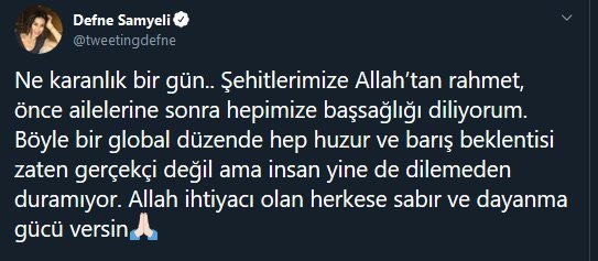 Sosyal medya hesabını aktif olarak kullanan Defne Samyeli de yaşanan bu acı kayıp sonrasında bir paylaşımda bulundu ve duygularını dile getirdi. Son zamanlarda adı sık sık magazin gündeminde yer alan Defne Samyeli, Twitter hesabından yaptığı paylaşımda şehitlerimiz için Allah’tan rahmet dilerken yaptığı global dünya düzeni tespitiyle de dikkat çekti.