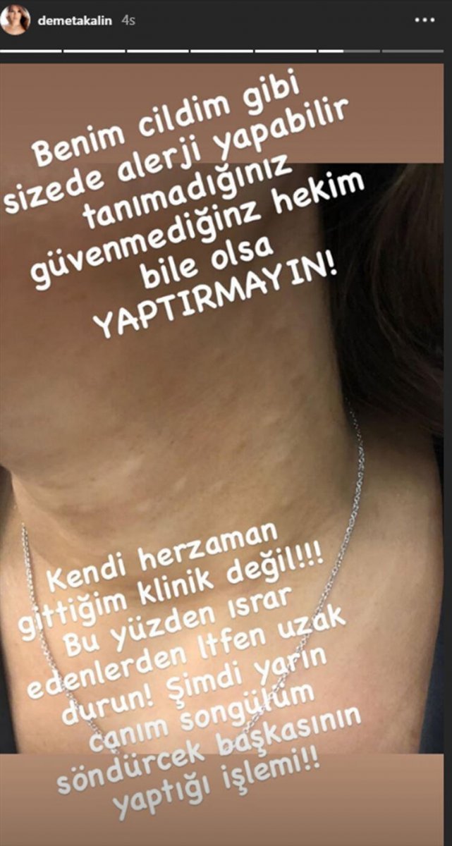 Ünlü şarkıcı, “Bilmediğiniz şeyleri yaptırmayın!Tanımadığınız güvenmediğiniz hekim bile olsa yaptırmayın! Israr edenlerden lütfen uzak durun!” diye takipçilerini uyardı.