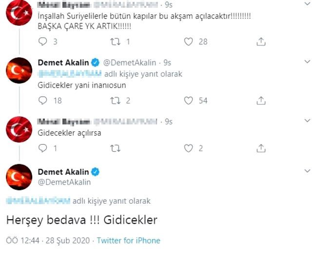 Sınır kapılarının açıldığı öğrenen binlerce mülteci, taksi ve otobüslerle Yunanistan ile Bulgaristan’a gidebilmek için harekete geçti. Bu haberler sosyal medyaya düşünce bir takipçisine cevap Demet Akalın, “İnşallah doğrudur” dedi. Akalın aynı kullanıcının “Gidecekler açılırsa” demesinin üzerine ise “Her şey bedava! Gidecekler” yanıtını verdi.