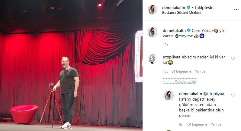 Instagram hesabı üzerinden “Cem Yılmaz iyi ki varsın” yazan Akalın, bu paylaşımına bir takipçisinin yaptığı “Ablacım neden iyi ki var ki?” şeklinde bir yorumu da yanıtsız bırakmadı ve “Kafamı dağıttı epey güldüm, zaten adam başka bir beklentide olun demiyor” şeklinde bir açıklamada bulundu.