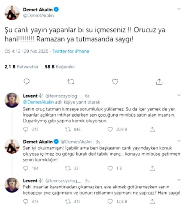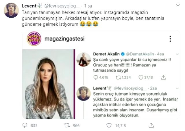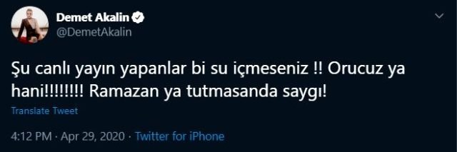 Şarkıcı Demet Akalın, sosyal medya hesabından canlı yayında su içenlere tepki gösterdi. Akalın, oruçlu olduğunu belirterek, canlı yayında su içenlerin, oruç tutan insanlara saygı göstermesi gerektiğini söyledi. Akalın, “Ramazan ya, tutmasan da saygı” yorumunda bulundu.