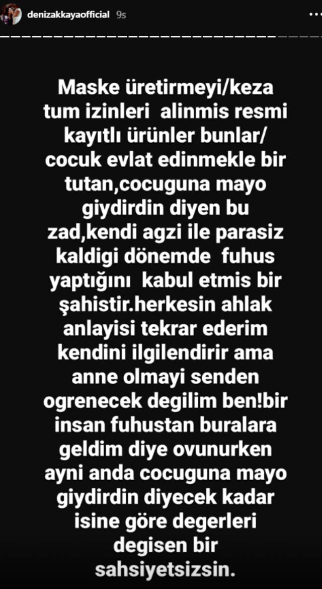 Kendisine koronavirüs döneminde maske üretmeye başladığı için yüklenen Selin Ciğerci’ye cevap veren Akkaya, “Maske ürettirmeyi, keza tüm izinleri alınmış resmi kayıtlı ürünler bunlar. Çocuk evlat edinmekle bir tutan, ‘Çocuğuna mayo giydirdin’ diyen zad. kendi ağzıyla parasız kaldığı dönemde fuhuş yaptığını kabul etmiş bir şahıstır. Herkesin ahlak anlayışı tekrar ederim kendini ilgilendirir. Ama anne olmayı senden öğrenecek değilim ben. Bir insan fuhuştan buralara geldim diye övünürken aynı anda çocuğuna mayo giydirdin diyecek kadar işine göre değerleri değişen bir şahsiyetsizsin” ifadelerini kullandı.