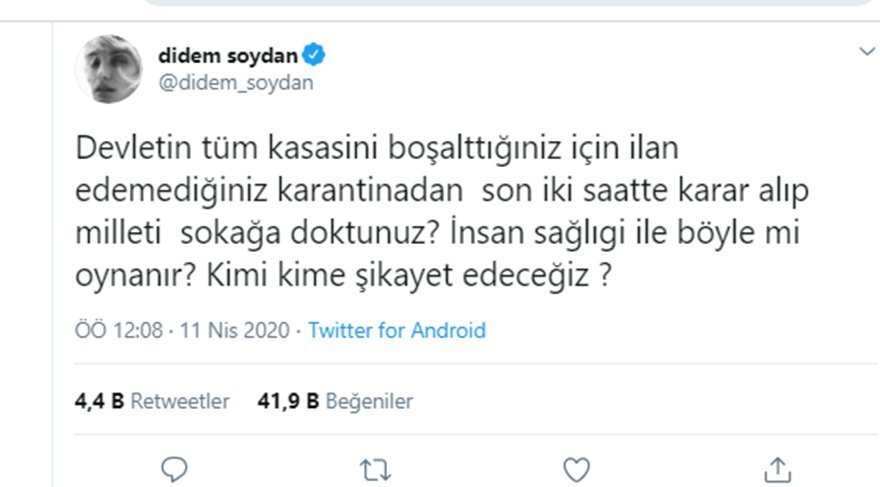 Pek çok ünlü isim gibi bu ani sokağa çıkma yasağının şaşkınlığını yaşayan Soydan, Twitter hesabından sert bir paylaşımda bulundu. İçişleri Bakanlığı, 10 Nisan saat 24.00 itibariyle, 30 büyük şehir ve Zonguldak’ta sokağa çıkma yasağı ilan edildiğini duyurdu. Akşam saatlerinde duyurulan bu karar vatandaşta paniğe sebep olurken marketlerde, manavlarda ve fırınlarda uzun kuyruklar oluştu.