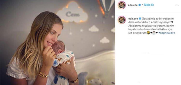 Eda Ece daha öncede en küçük yeğeni ile paylaşımda bulunmuş ve ablalarına “Bir yeğenim daha oldu! Artık 3 erkek teyzesiyim. Ablalarıma teşekkür ediyorum, benim hayatıma bu lokumları kattıkları için. Kız bekliyorum…” diye seslenmişti.