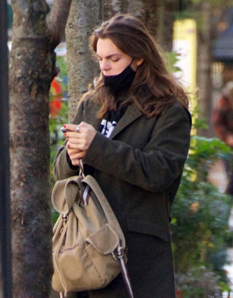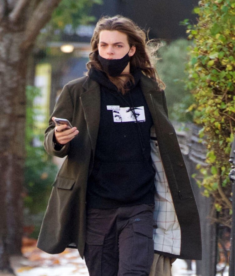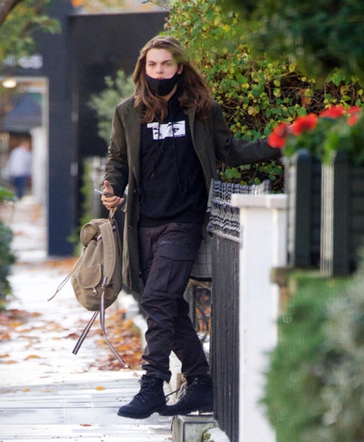 Bağcıklarını bağlamadığı botları, cepli pantolonu, spor kabanı ile sokağa çıkan Damian Hurley, giysilerine uygun renkteki maskesini de eksik etmedi.