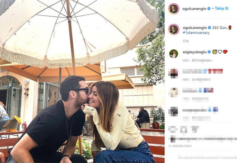Oğulcan Engin, sevgilisini öperken çekilen karesine, ‘yıl dönümü’ etiketi ile birlikte “365 gün” notunu düştü. Kendisi gibi oyuncu olan Kaan Yıldırım’la üç yıllık evliliğini 2019’da sonlandıran Ezgi Eyüboğlu, aynı fotoğrafı, “Bir yıl” notuyla sosyal medya hesabından takipçileriyle paylaştı.