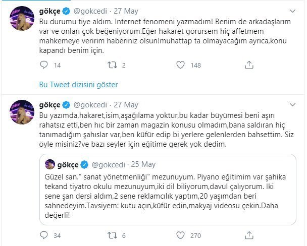 Gökçe’nin Twitter paylaşımı kısa sürede binlerce beğeni aldı. Tepkileri de ardından getiren paylaşımından sonra Gökçe, tekrar bir açıklama yaparak, “Bu yazımda hakaret, isim aşağılama yoktur. Bu kadar büyümesi beni aşırı rahatsız etti” dedi.