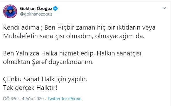 Özoğuz, “Kendi adıma; Ben hiçbir zaman hiçbir iktidarın veya muhalefetin sanatçısı olmadım, olmayacağım da. Ben yalnızca halka hizmet edip, halkın sanatçısı olmaktan şeref duyanlardanım. Çünkü sanat halk için yapılır. Tek gerçek halktır!” dedi.