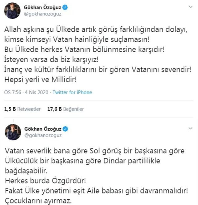 Athena grubunun solisti Gökhan Özoğuz, yaptığı paylaşımlardan sonra kendisine vatan haini diyenlere tepki gösterdi. Twitter hesabından yaptığı açıklama ile kimsenin vatan haini olmadığını söyleyen Özoğuz “Allah aşkına, şu ülkede görüş farklılığı nedeniyle kimse kimseyi vatan hainliği ile suçlamasın. Bu ülkede herkes vatanın bölünmesine karşıdır. İsteyen varsa da biz karşıyız. İnanç ve kültür farklılıklarını bir göre, vatan severdir. Hepsi yerli ve millidir” dedi.
