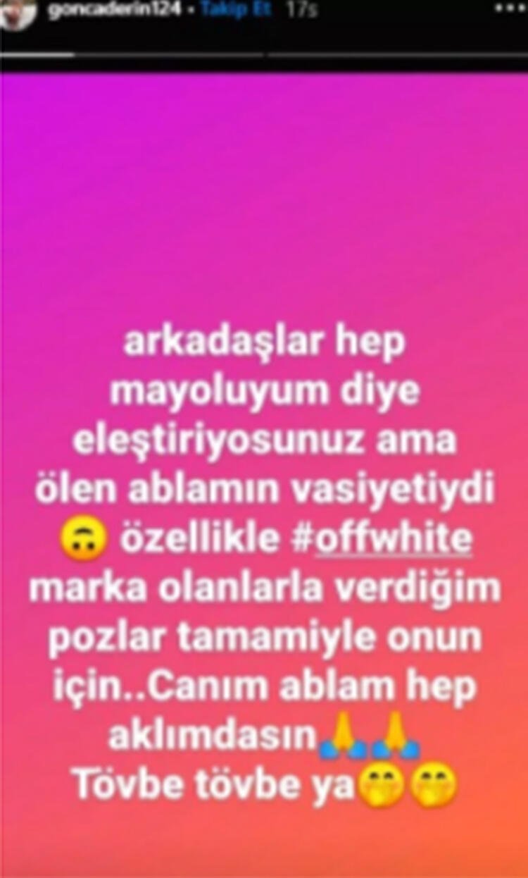 Derin,sosyal medya hesabından yaptığı paylaşıma, “Arkadaşlar hep mayoluyum diye eleştiriyorsunuz ama ölen ablamın vasiyetiydi” notunu düşmüştü. Bu gönderme sosyal medyada da günlerce konuşulmuştu.