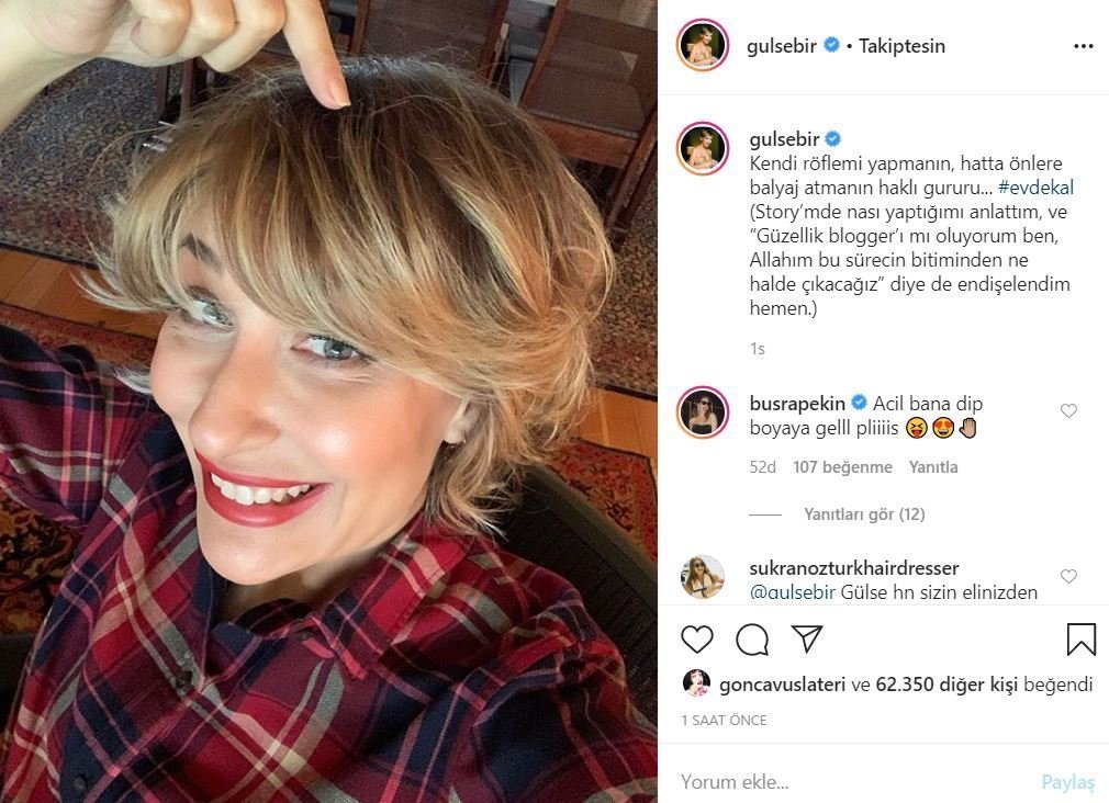 Senarist ve oyuncu Gülse Birsel, Instagram hesabından yaptığı paylaşımla takipçilerini hayrete düşürdü. Saçını gösterdiği fotoğrafın altına “Kendi röflemi yapmanın, hatta önlere balyaj atmanın haklı gururu… #evdekal Story’mde nası yaptığımı anlattım. “Güzellik blogger’ı mı oluyorum ben, Allahım bu sürecin bitiminden ne halde çıkacağız” diye de endişelendim hemen” diyen Birsel, Instagram’ın hikaye bölümünde ise nasıl yaptığını anlattı.