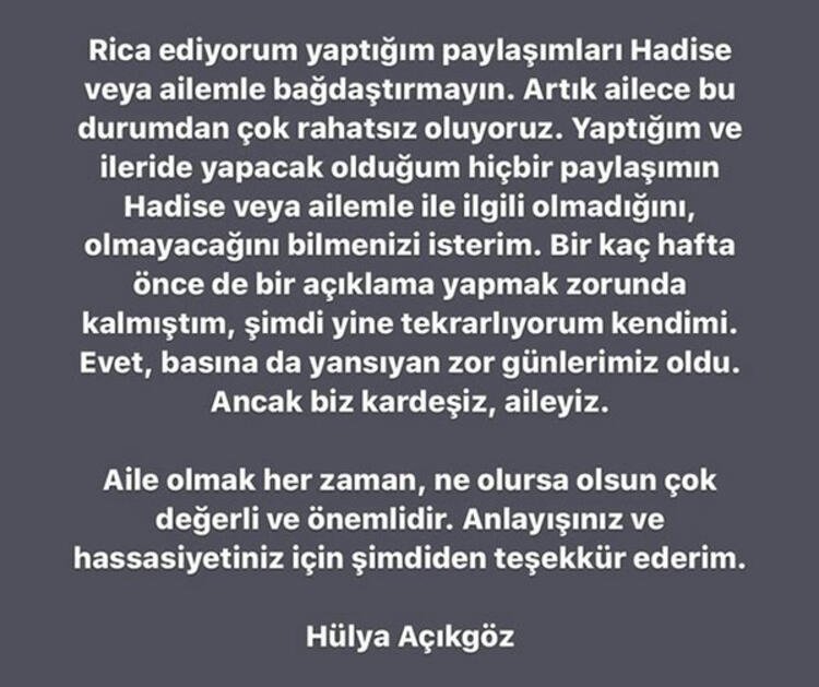 “Artık ailece bu durumdan çok rahatsız oluyoruz. Yaptığım ve ileride yapacak olduğum hiçbir paylaşımın Hadise veya ailemle ilgili olmadığını, olmayacağını bilmenizi isterim. Birkaç hafta önce de bir açıklama yapmak zorunda kalmıştım, şimdi yine tekrarlıyorum kendimi. Evet, basına da yansıyan zor günlerimiz oldu. Ancak biz kardeşiz, aileyiz. Aile olmak her zaman, ne olursa olsun çok değerli ve önemlidir. Anlayışınız ve hassasiyetiniz için şimdiden teşekkür ederim.”