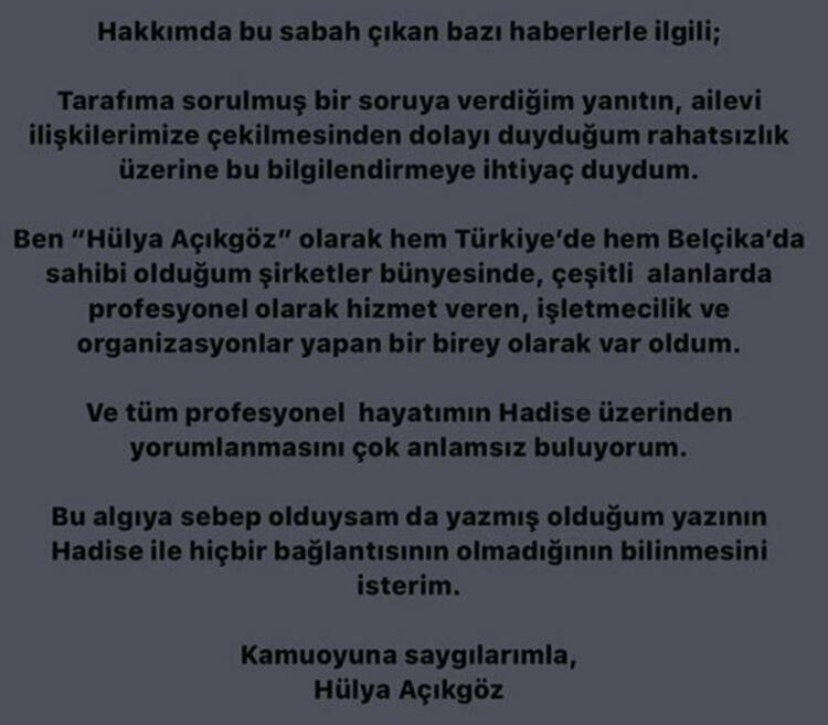 “Hakkımda bu sabah çıkan bazı haberlerle ilgili; tarafıma sorulmuş bir soruya verdiğim yanıtın, ailevi ilişkilerimize çekilmesinden dolayı duyduğum rahatsızlık üzerine bu bilgilendirmeye ihtiyaç duydum. Ben ‘Hülya Açıkgöz’ olarak hem Türkiye’de, hem Belçika’da sahip olduğum şirketler bünyesinde, çeşitli alanlarda profesyonel olarak hizmet veren, işletmecilik ve organizasyonlar yapan bir birey var olarak var oldum. Ve tüm profesyonel hayatımın Hadise üzerinden yorumlanmasını çok anlamsız buluyorum. Bu algıya sebep olduysam da yazmış olduğum yazının Hadise ile hiçbir bağlantısının olmadığının bilinmesini isterim. Kamuoyuna saygılarımla.”