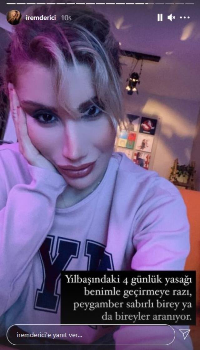 Yeni alınan sokağa çıkma yasağını duyan şarkıcı İrem Derici ise Instagram hesabından dikkat çeken bir paylaşım yaptı. İrem Derici ilk paylaşımında “Yılbaşındaki 4 günlük yasağı benimle geçirmeye razı peygamber sabırlı birey ya da bireyler aranıyor” yazdı. Peş peşe kadınların mesaj atmasından hoşlanmayan Derici, yeni bir paylaşım yaparak “Hep kızlar yazıyor” deyip üzüntüsünü dile getirdi.