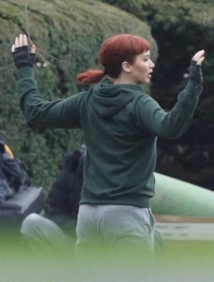 Rol gereği koşuya çıkan Lawrence çekilen sahnede, senaryoya uygun olarak göz altına alındı. O sırada da yeni görüntüsü dikkat çekti.