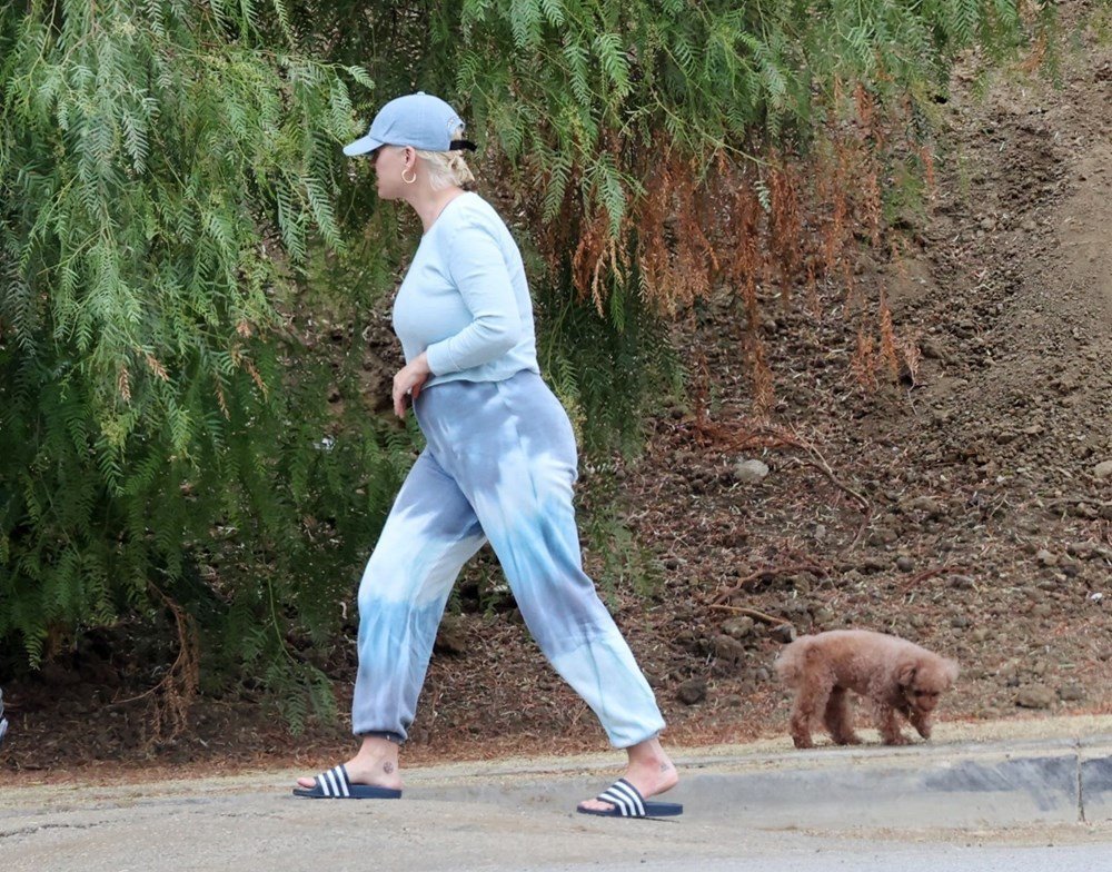 Amerikalı şarkıcı, doğum günü sabahında Los Angeles’taki evinin yakınlarında köpeğini yürüyüşe çıkarırken objektiflere yansıdı.