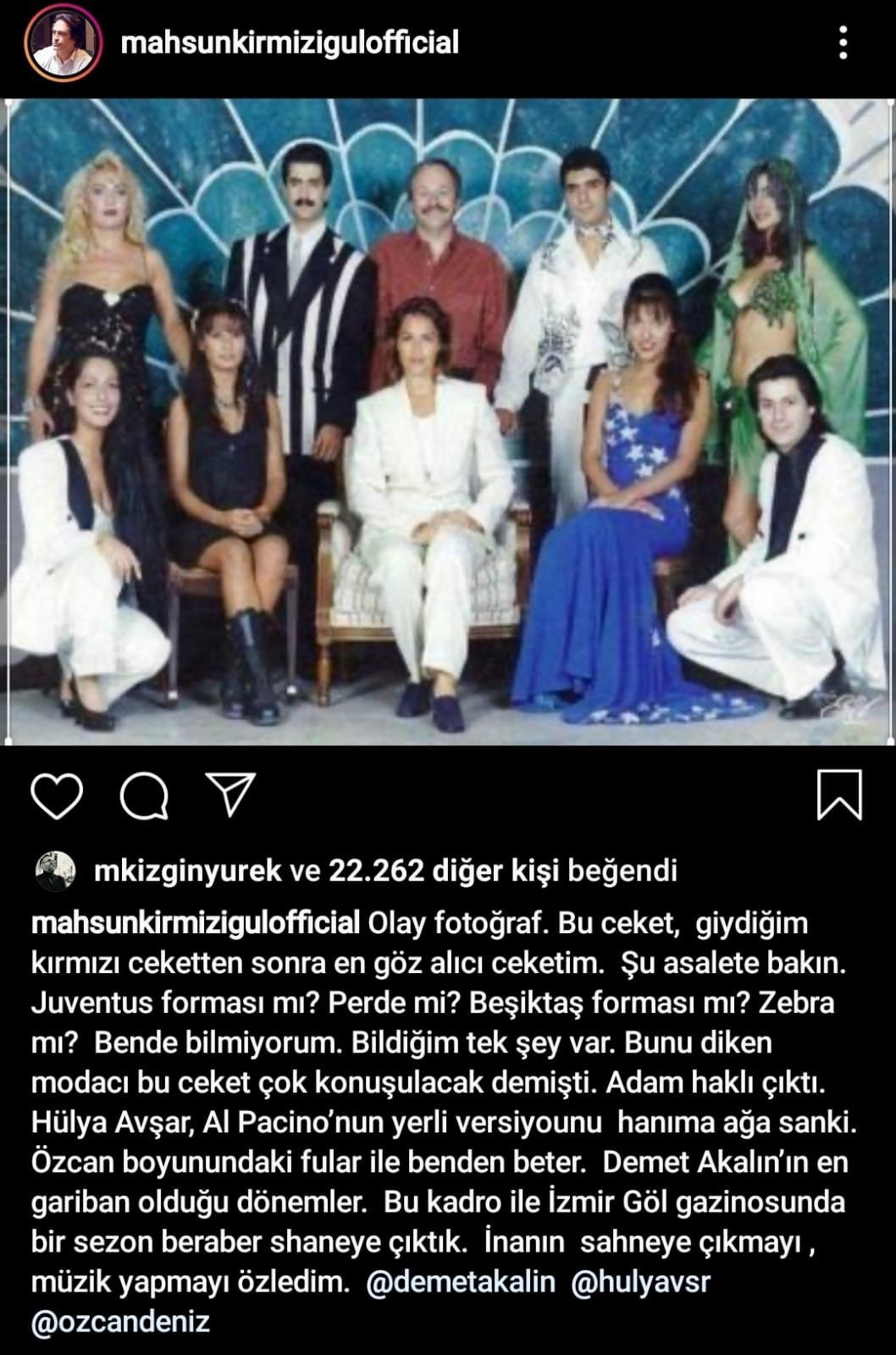 Ünlü sinemacı ve türkücü Mahsun Kırmızıgül, bir gazino sahnesi için Özcan Deniz, Hülya Avşar, Demet Akalın, Nalan’la birlikte çekilen fotoğrafını Twitter’da ve Instagram’da ‘Olay fotoğraf’ diyerek paylaştı ve fotoğrafta giydiği ceketin hikayesini şöyle anlattı: “Bu ceket, giydiğim kırmızı ceketten sonra en göz alıcı ceketim. Şu asalete bakın. Juventus forması mı? Perde mi? Beşiktaş forması mı? Zebra mı? Bende bilmiyorum. Bildiğim tek şey var. Bunu diken modacı bu ceket çok konuşulacak demişti. Adam haklı çıktı. Hülya Avşar, Al Pacino’nun yerli versiyonu hanıma ağa sanki. Özcan boyunundaki fular ile benden beter. Demet Akalın’ın en gariban olduğu dönemler. Bu kadro ile İzmir Göl gazinosunda bir sezon beraber sahneye çıktık. İnanın sahneye çıkmayı, müzik yapmayı özledim.”