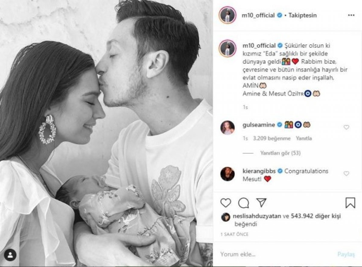 Mesut Özil, Instagram hesabından yaptığı paylaşımda, “Şükürler olsun ki kızımız Eda sağlıklı bir şekilde dünyaya geldi. Rabbim bize, çevresine ve bütün insanlığa hayırlı bir evlat olmasını nasip eder inşallah,” notuyla, bu güzel haberi takipçilerine duyurmuştu.