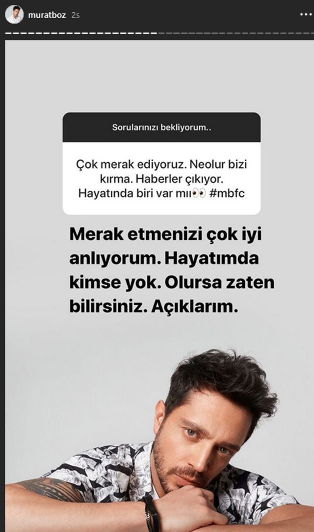 Ünlü şarkıcı Murat Boz, Instagram hesabı üzerinden hayranlarından gelen soruları yanıtladı. Aşk hayatıyla alakalı konuşmadığı bilinen Boz, Murat Boz Fun Club üyesi bir hayranının “Çok merak ediyoruz. Ne olur bizi kırma. Haberler çıkıyor. Hayatında biri var mı? #mbfc” sorusu üzerine hayranının ricasını kırmadı.