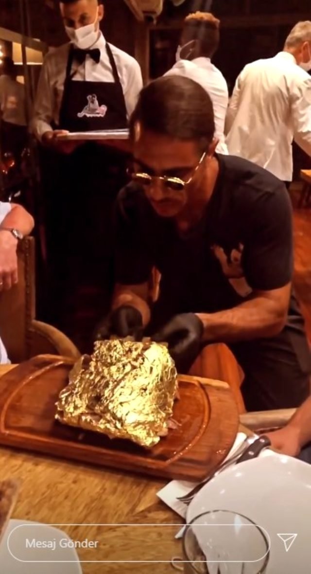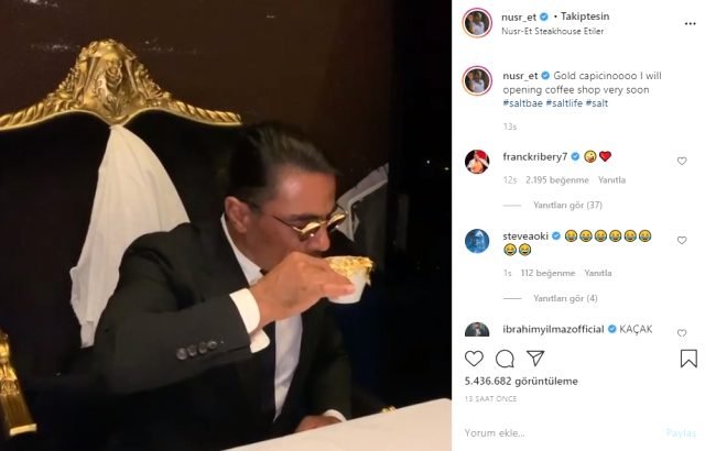 Dünyanın çeşitli yerlerinde restoranı bulunan sosyetik kasap Nusret Gökçe, altın kaplama ürünleriyle adından söz ettirmeye devam ediyor. İlk olarak eti altına bulayan Gökçe, şimdi de içtiği Cappuccino‘ya altın serpiştirdi.