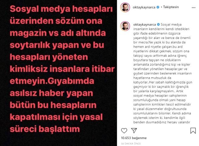 “Her sabah kalktığımızda gün geçmiyor ki bir saçmalık bir iğrençlik bir yalanla karşılaşmayalım. Artık sosyal medya hesapları sahiplerinin sorumluluğunda olmalı yani hesap sahiplerinin kimlikleri tescil edilmelidir ki yasal düzenlemeler doğrultusunda sorumluluklarını bilsinler. Kendi adıma söylemek isterim ki, kendimle ilgili benden duymadığınız her şey yalandır ve benim adıma bunu yapan herkesle ilgili yasal mücadelem devam edecektir.”